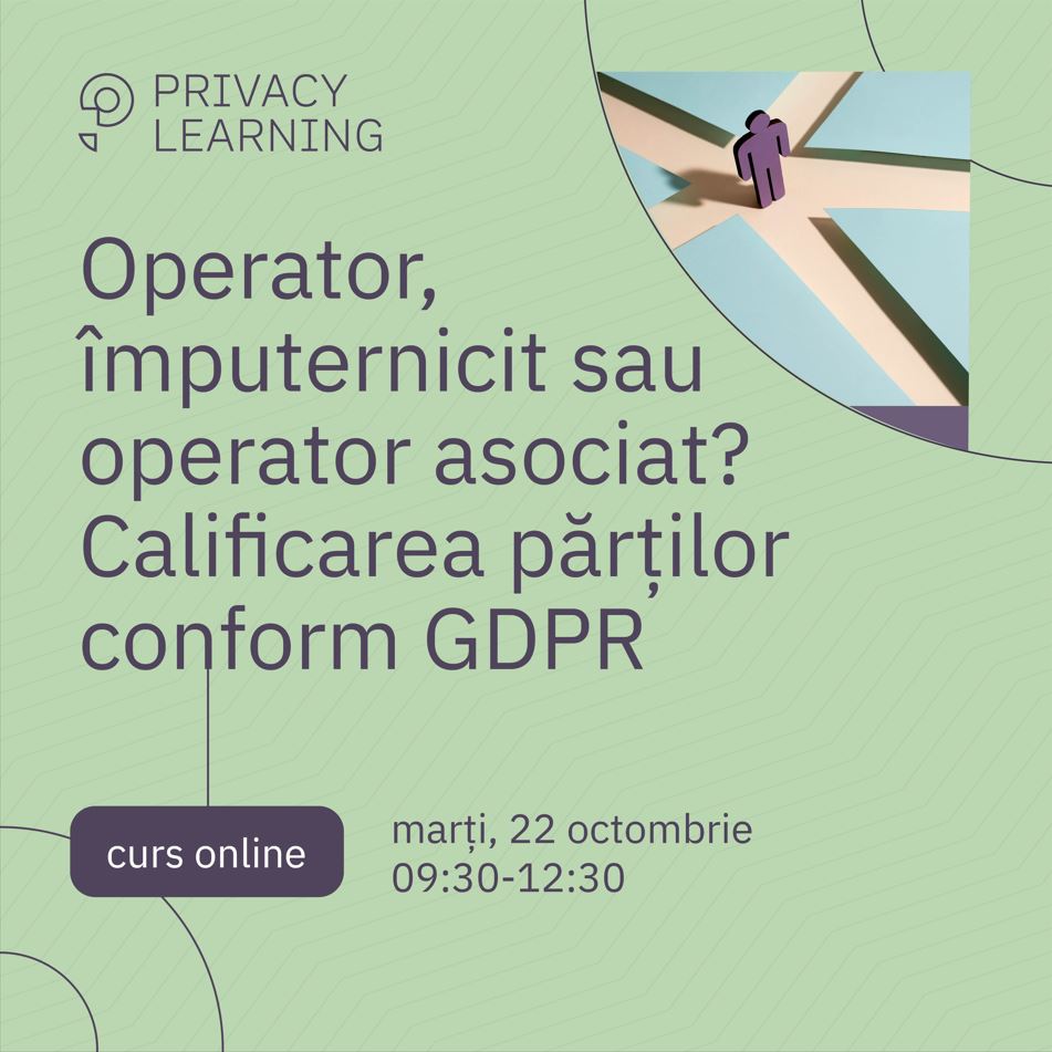 prin completarea formularului sau prin e-mail la contact@privacylearning.roCa parte a acestei comunități, vei primi mesaje cu noutăți din domeniul protecției datelor personale și invitații la evenimentele DPO Sessions adresate responsabililor cu protecția datelor. Colectăm adresa ta de e-mail, numele și compania la care lucrezi pentru a te include în lista de abonați ai comunității DPO. Te poți dezabona oricând folosind linkul de la finalul fiecărui mesaj. Află mai multe despre felul în care prelucrăm datele personale în Informarea noastră privind prelucrarea datelor.